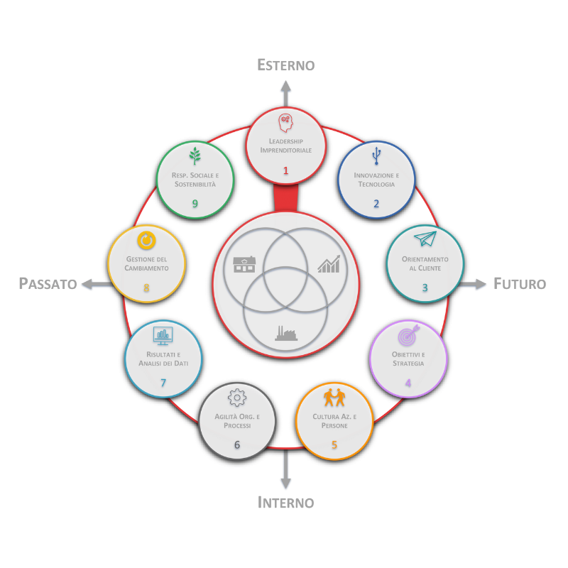 9 ambiti di intervento > Leadership imprenditoriale, Innovazione e Tecnologia, Orientamento al Cliente, Obiettivi e Strategia, Cultura Aziendale e Persone, Agilità Organizzativa e Processi, Risultati e Analisi dei Dati, Gestione del Cambiamento e Responsabilità Sociale e Sostenibilità
